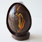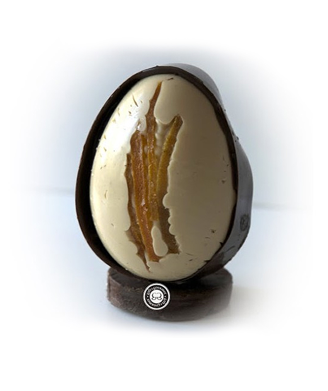 Huevo de chocolate cobertura semiamargo, con leche o blanco con naranja confitada.